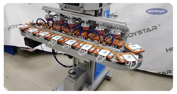 중국의 전문 제조업체로서 우리는 컨베이어 작업대가 포함된 고효율 HOYSTAR 6색 패드 프린터를 제공하고 싶습니다. 이 기계는 제품에 대해 연속적인 6개 컬러 패드 인쇄를 가능하게 하며 단일 사이클에 하나의 색상 등록이 완료됩니다. 이 기계는 회전식 턴테이블 이송 시스템을 채택하여 인쇄 과정 전반에 걸쳐 지속적이고 원활한 제품 이동을 가능하게 하며 단 한 번의 회전 주기로 전체 6색 중복 인쇄를 완료할 수 있습니다. 셔틀형 패드프린터에 비해 속도가 매우 빠릅니다.